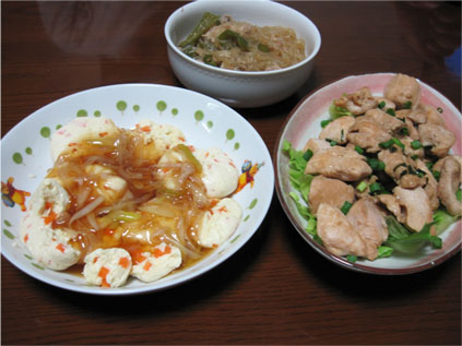 あとは残ってた春雨とピーマンをん煮て、お豆腐に甘酢あんかけかけて
